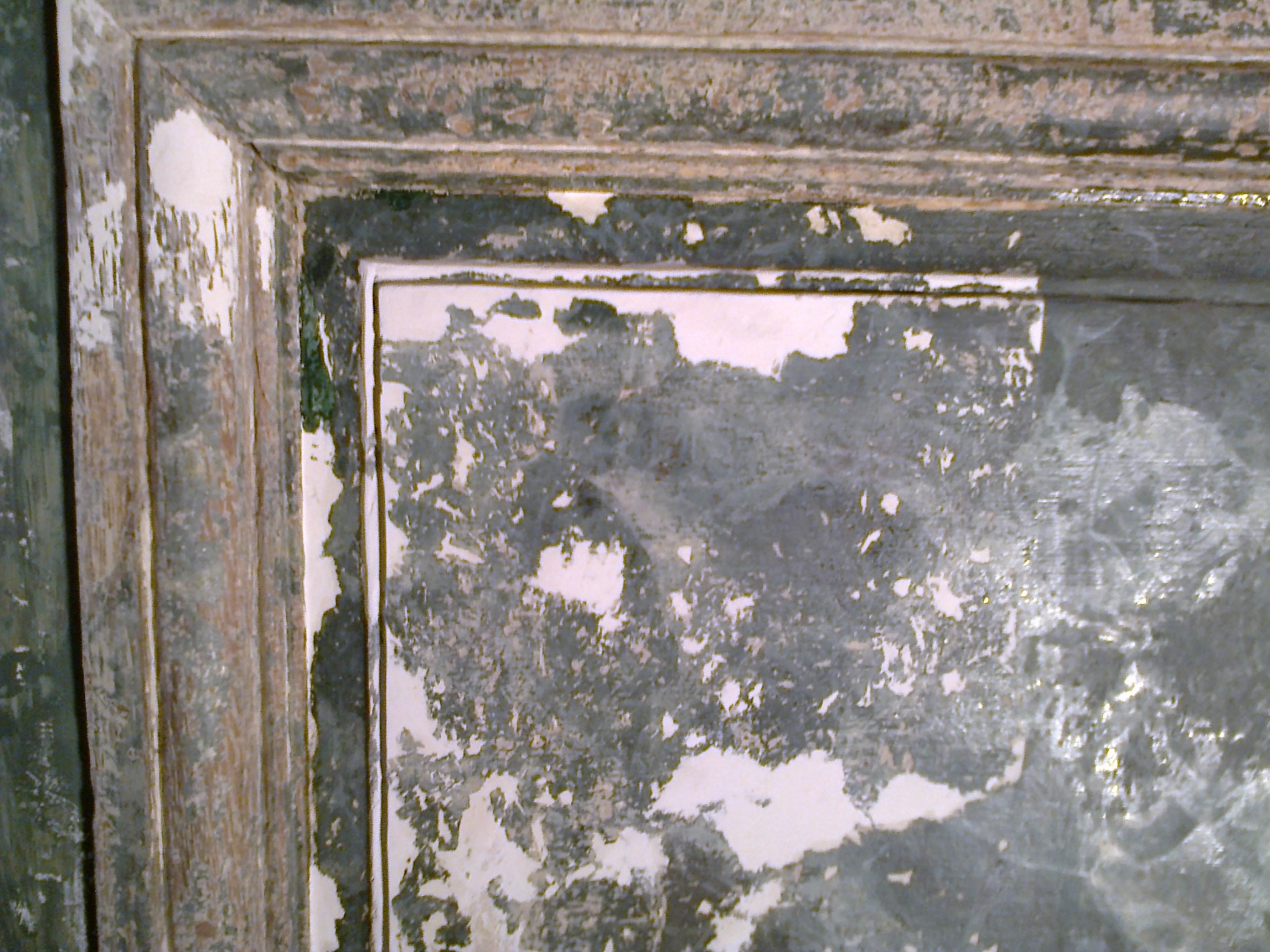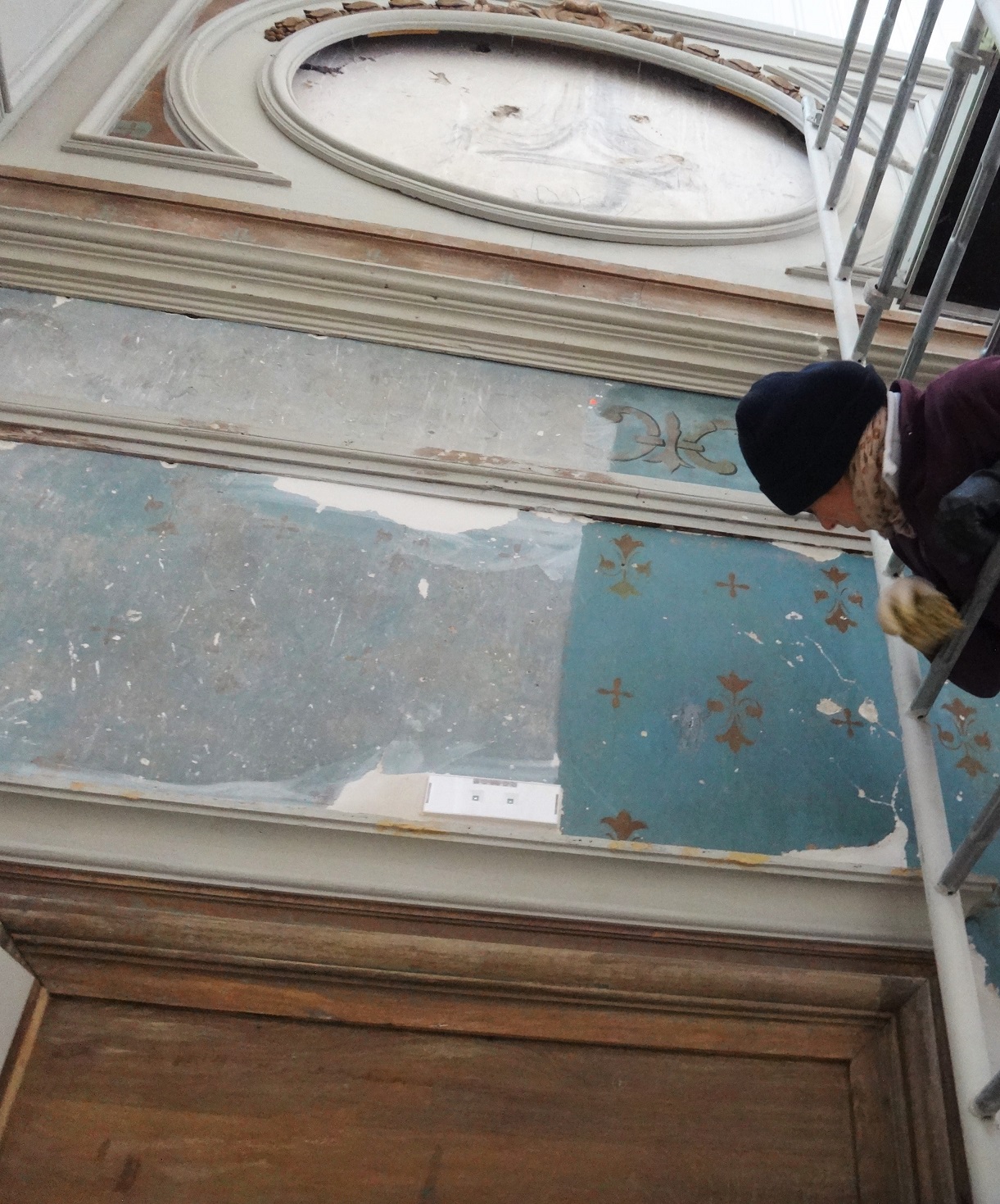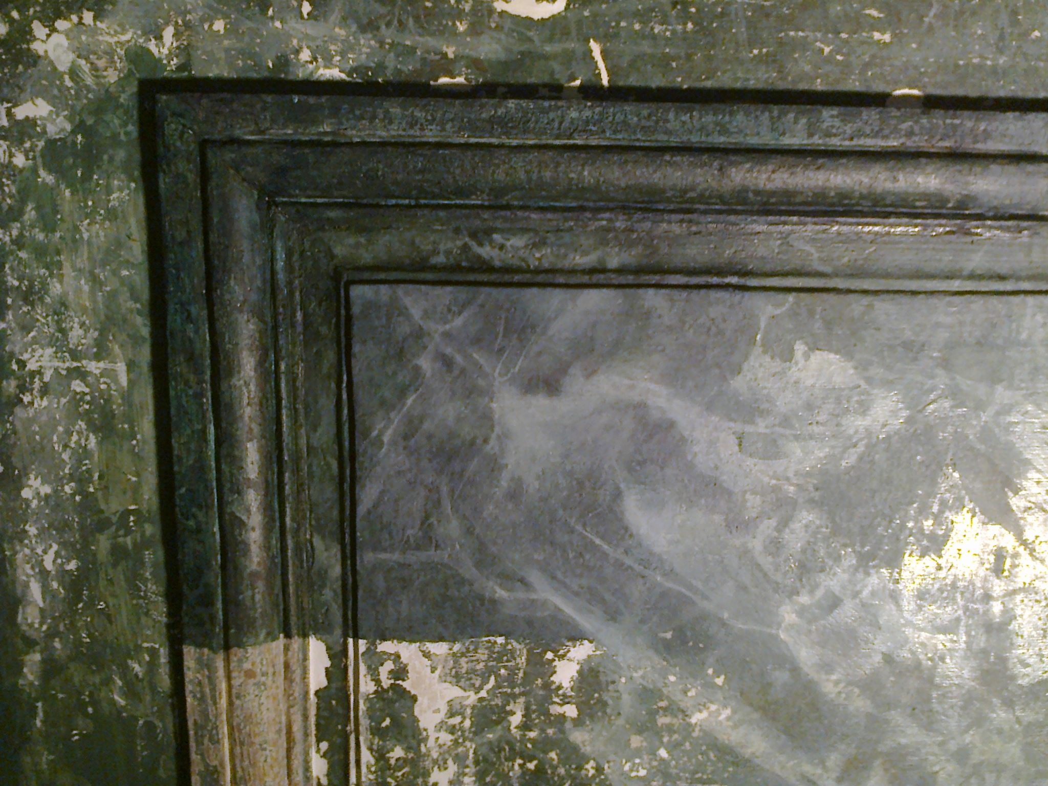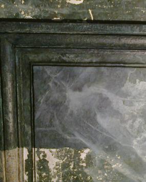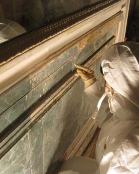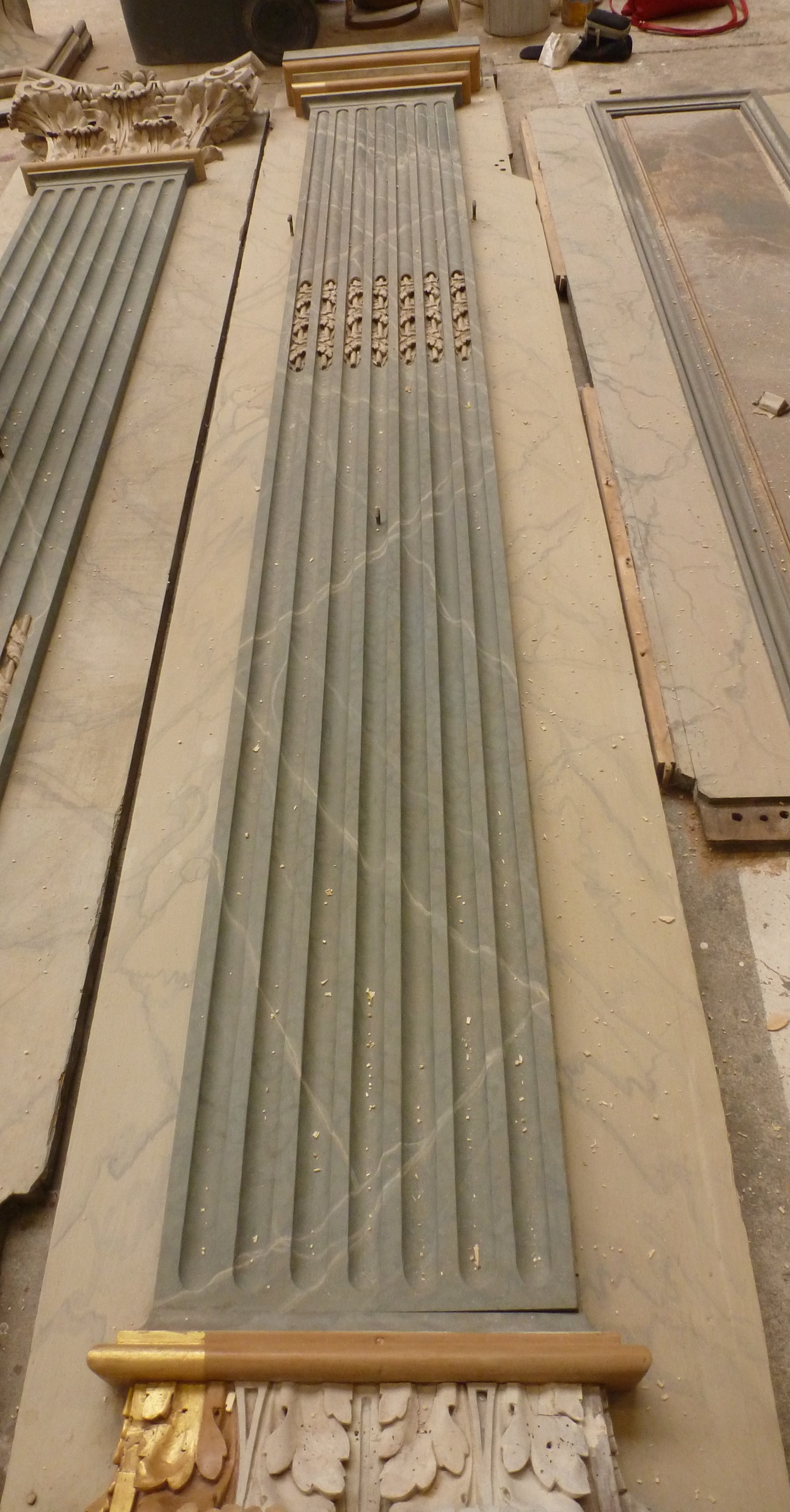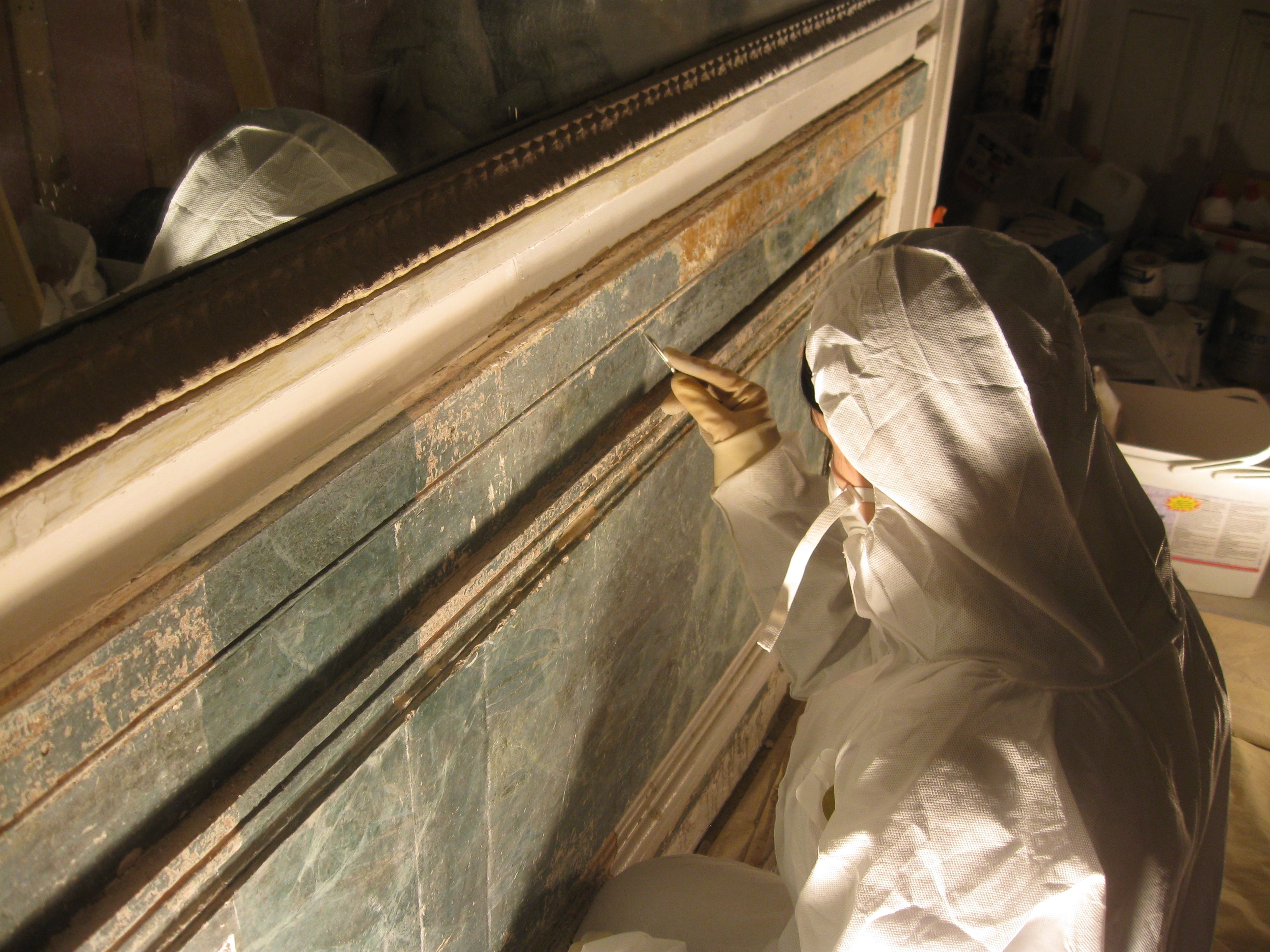 Dégagement, comblement et retouche en cours d'un faux-marbre.
