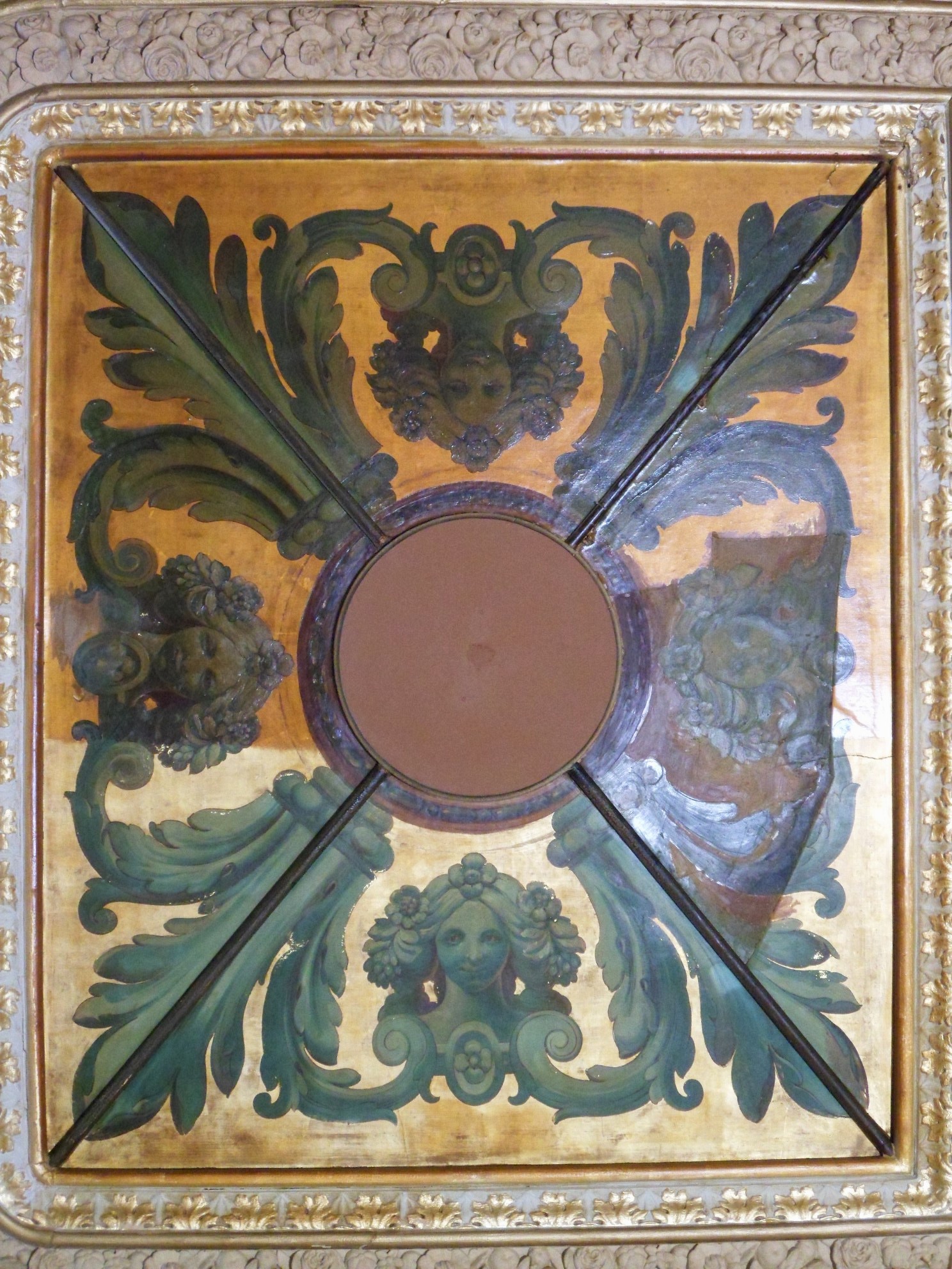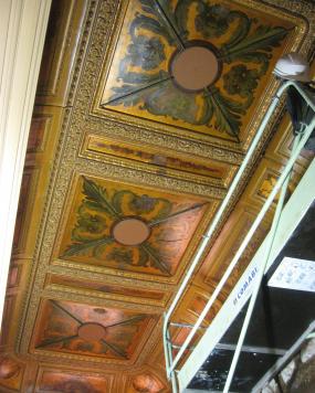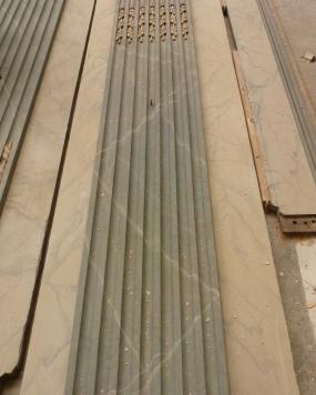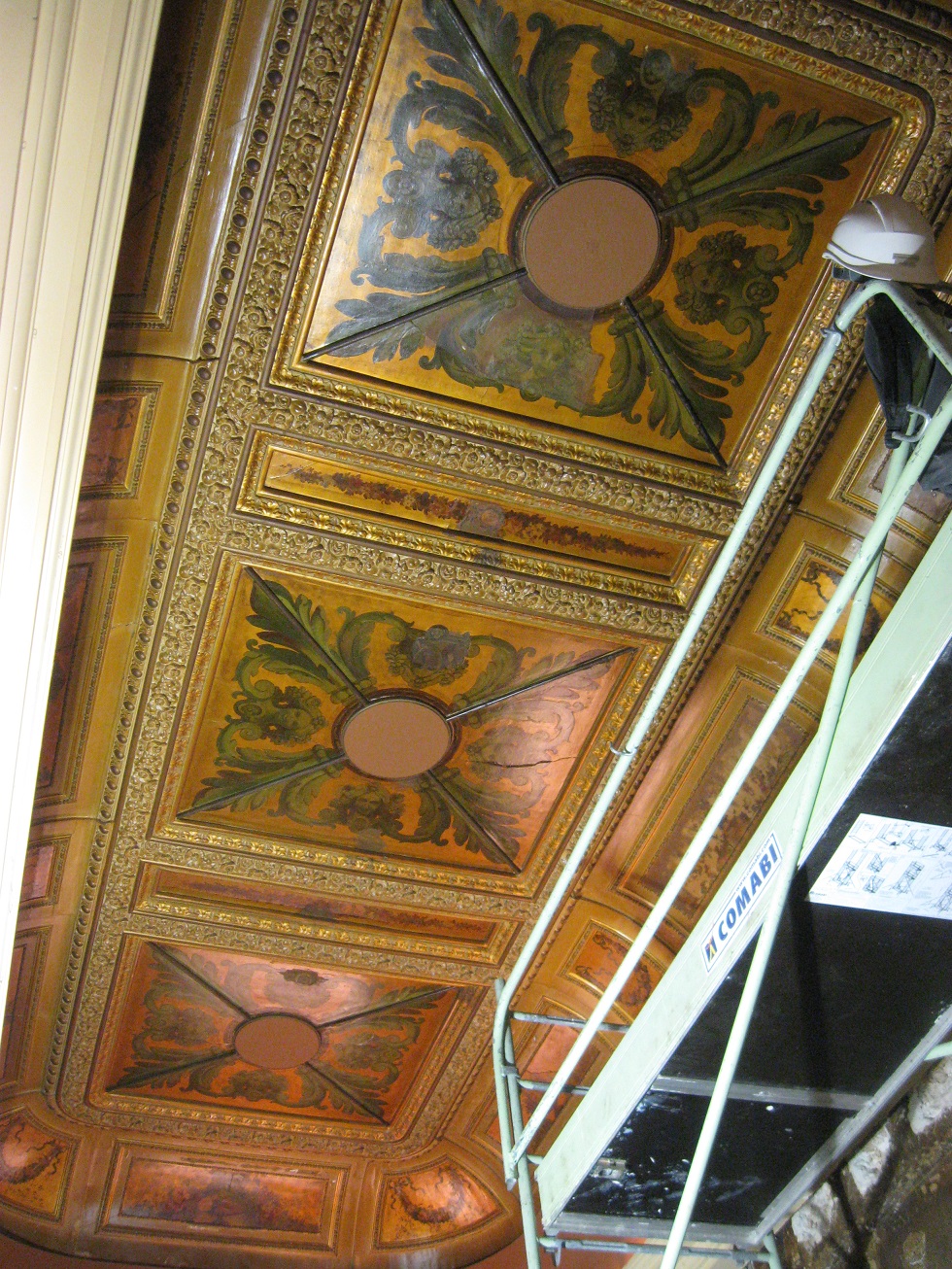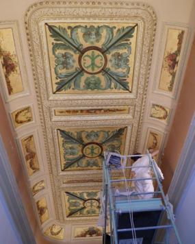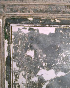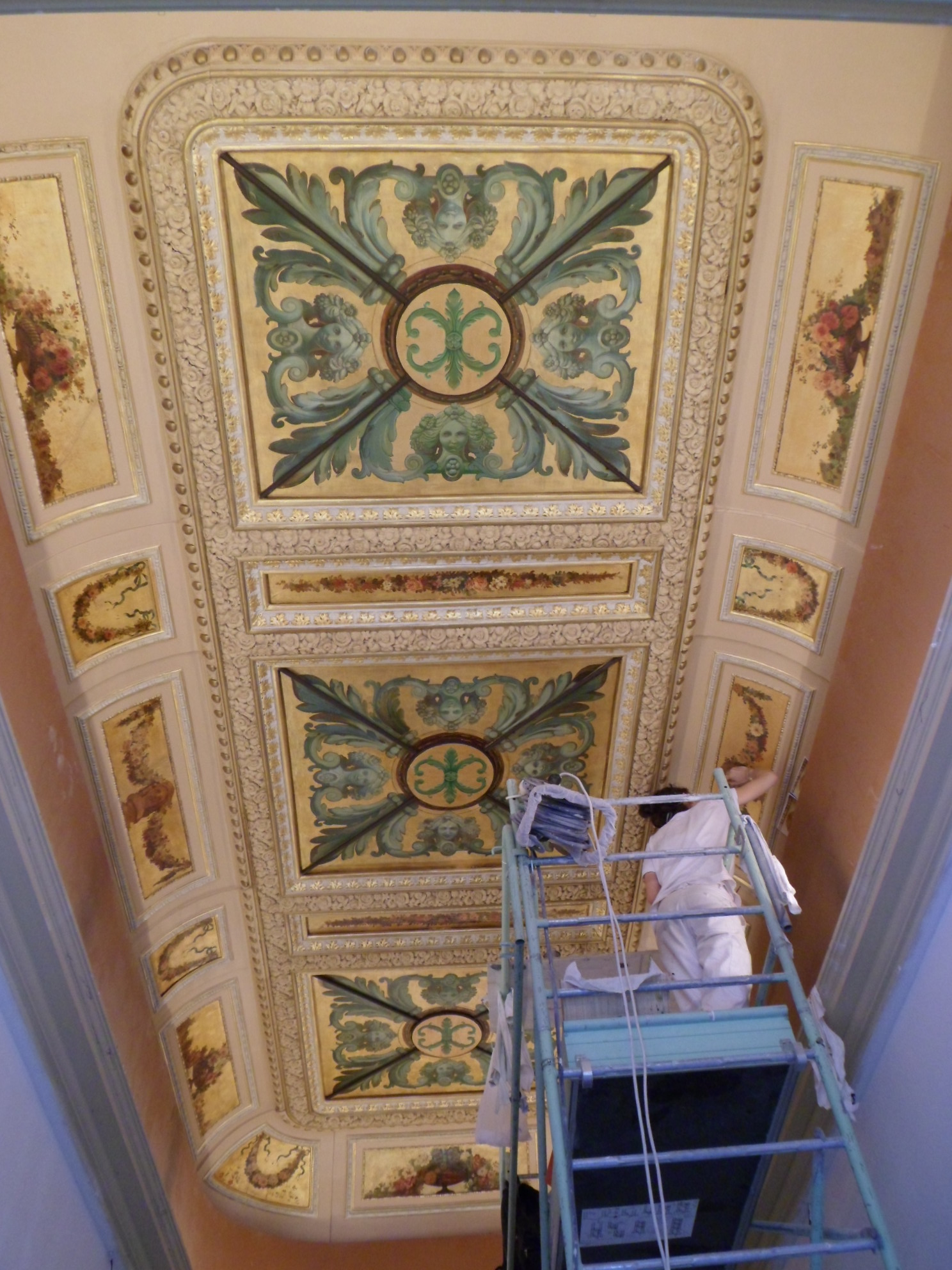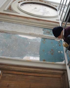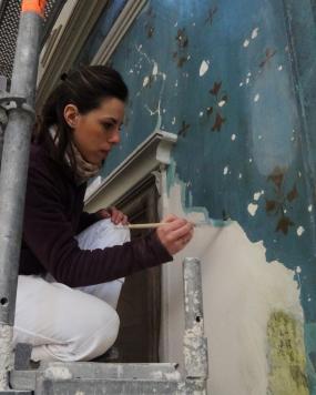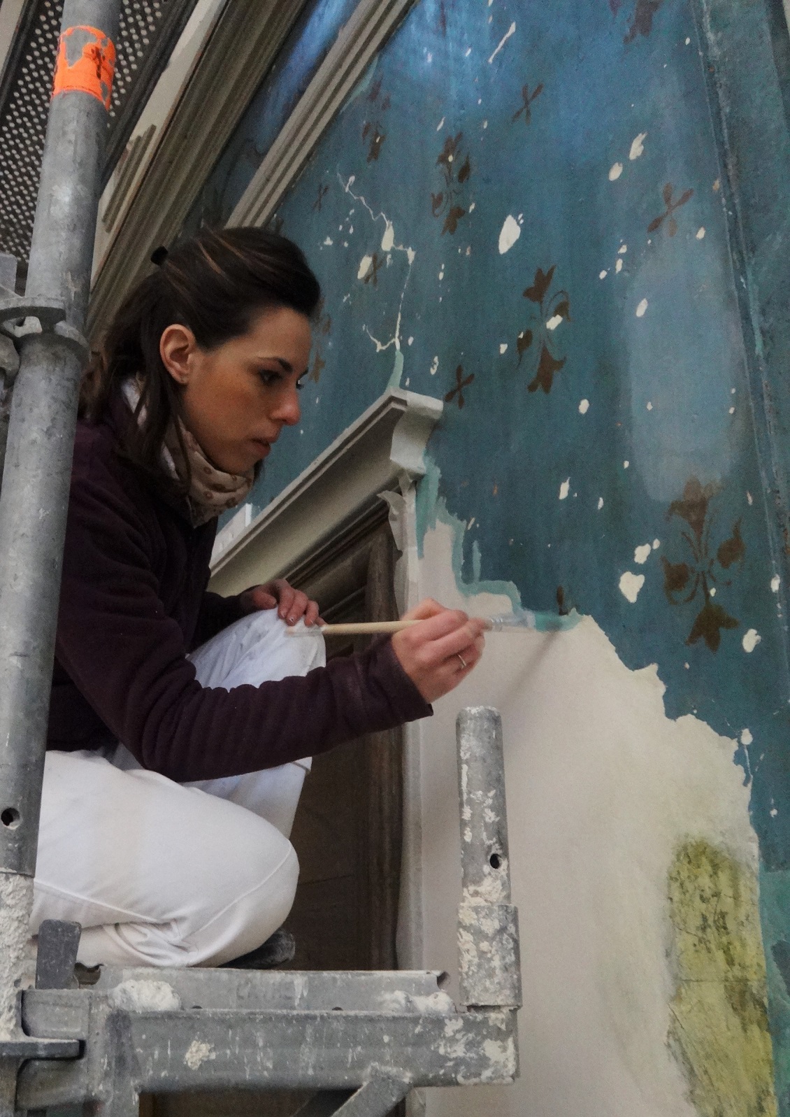 Dégagement, comblement et retouche en cours d'un faux-marbre.