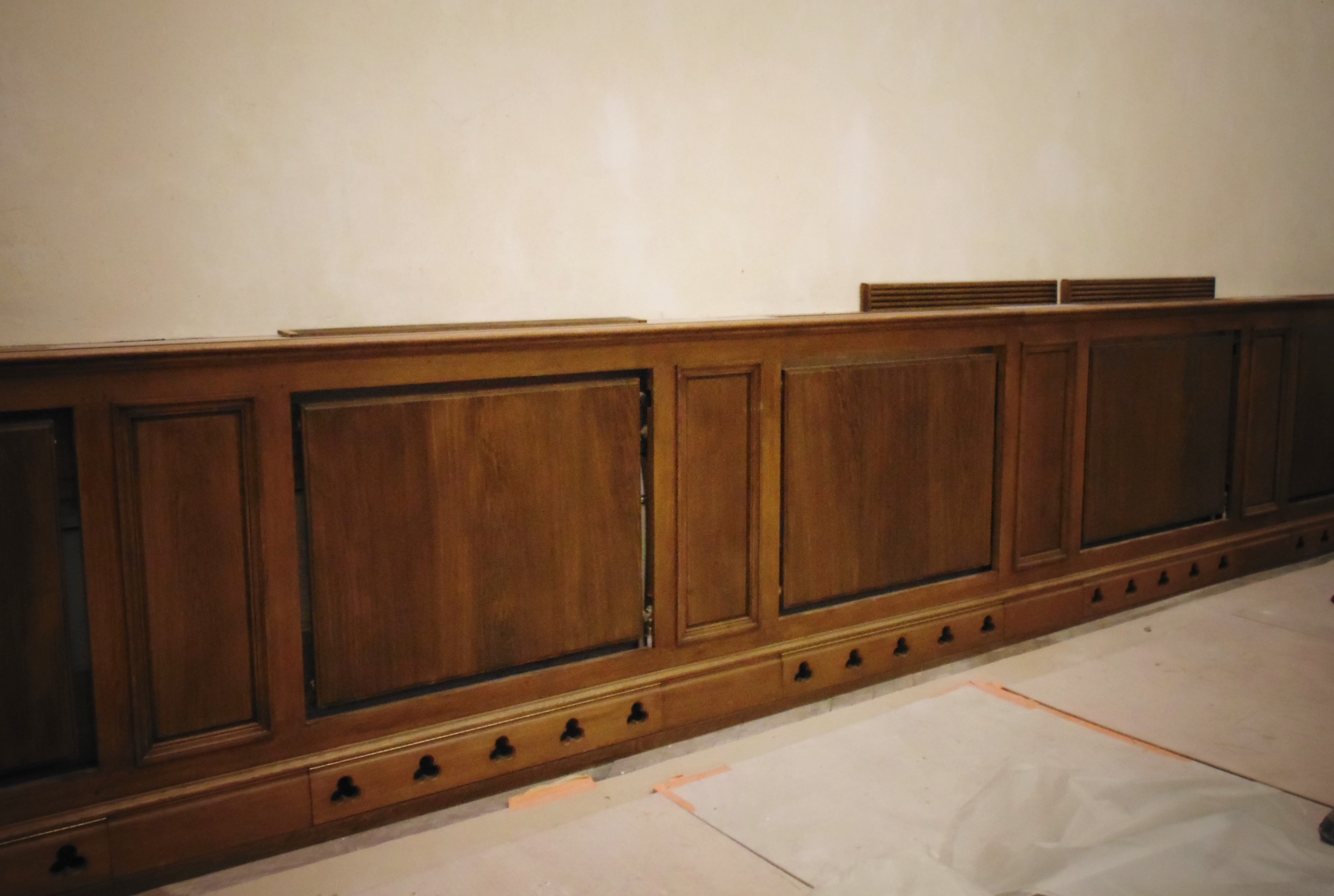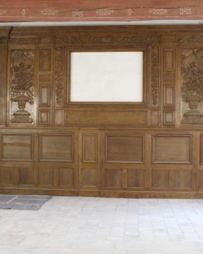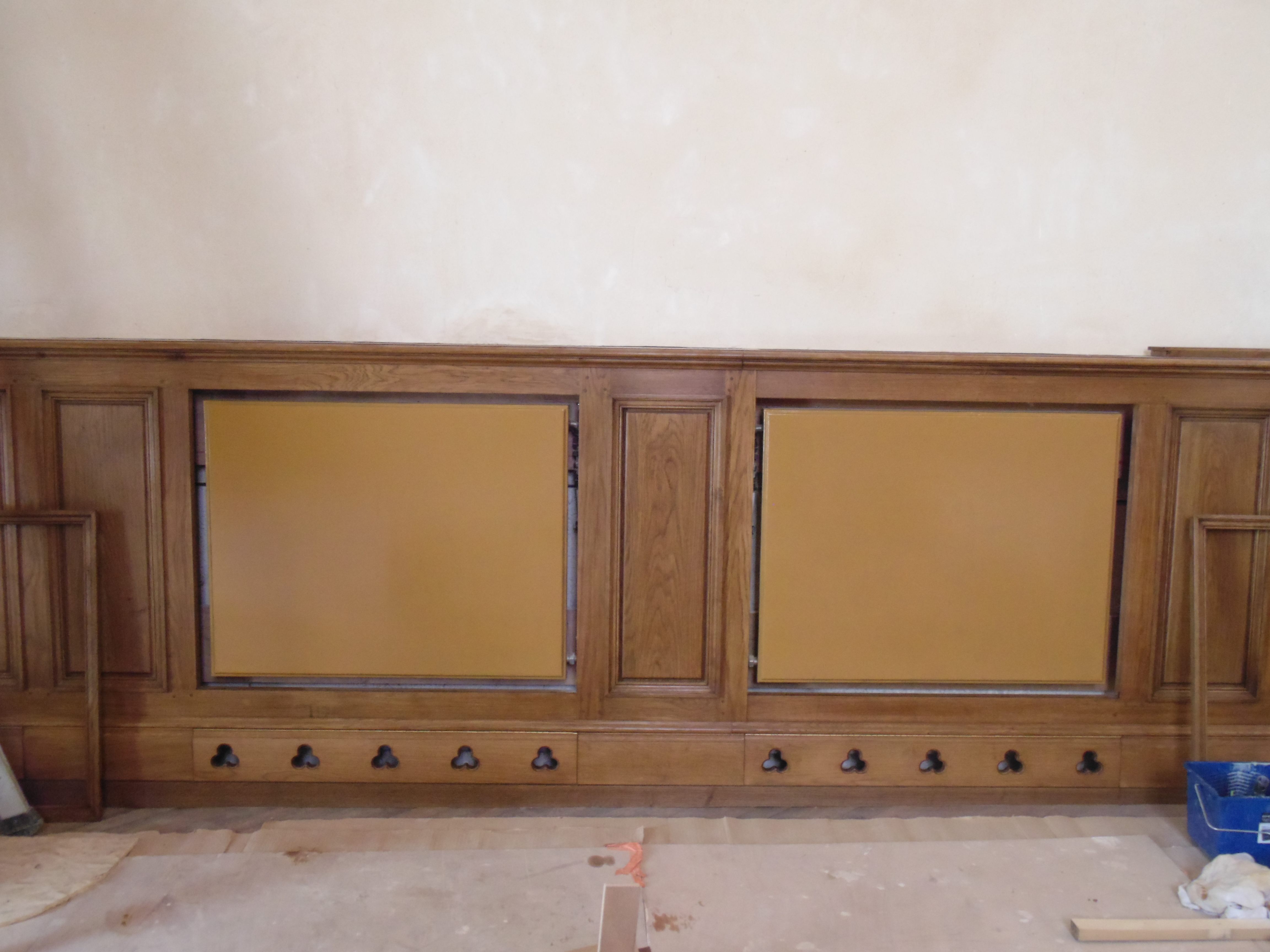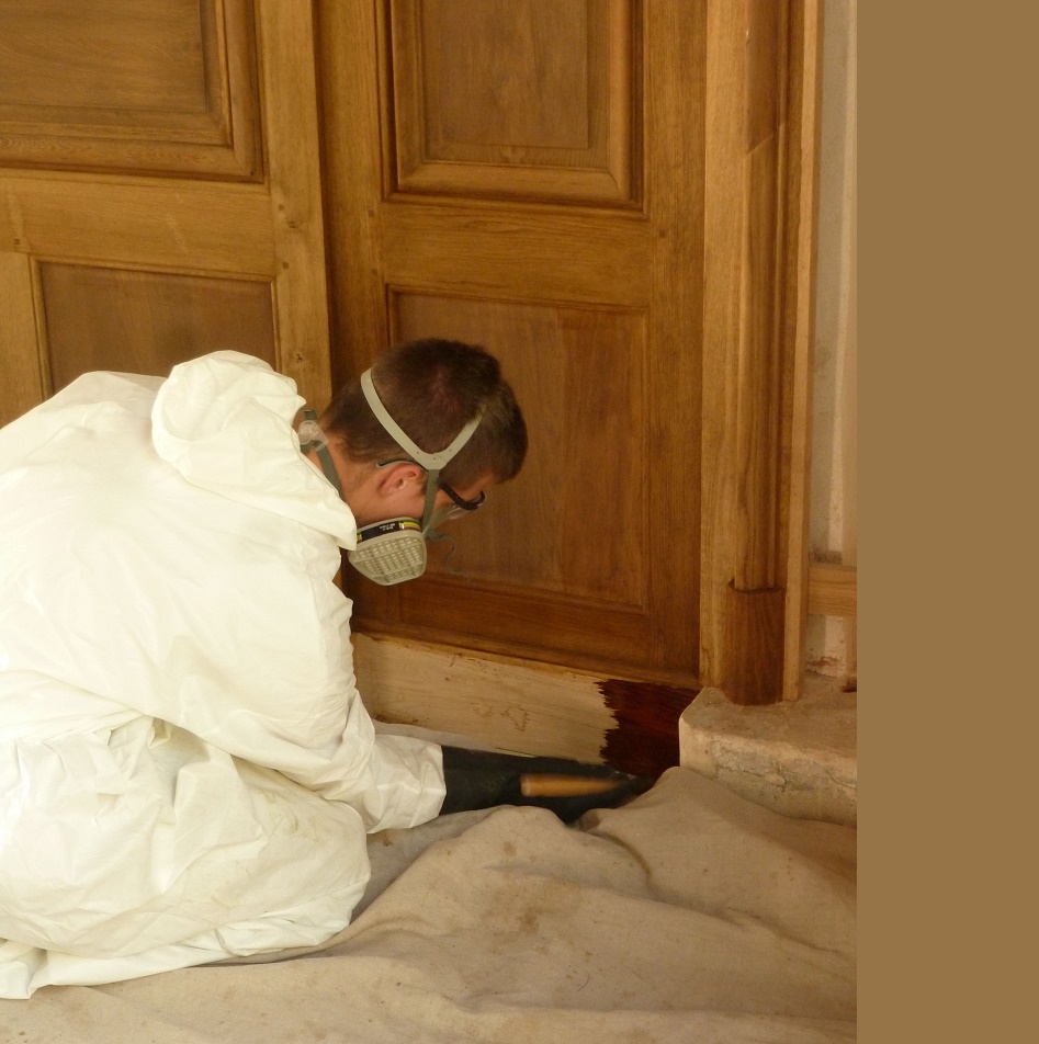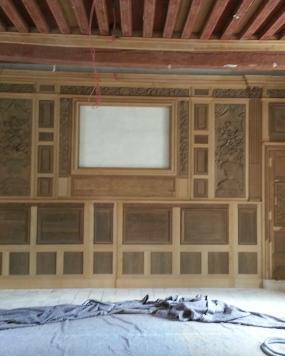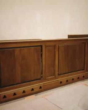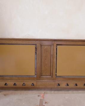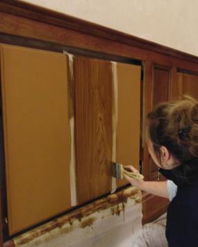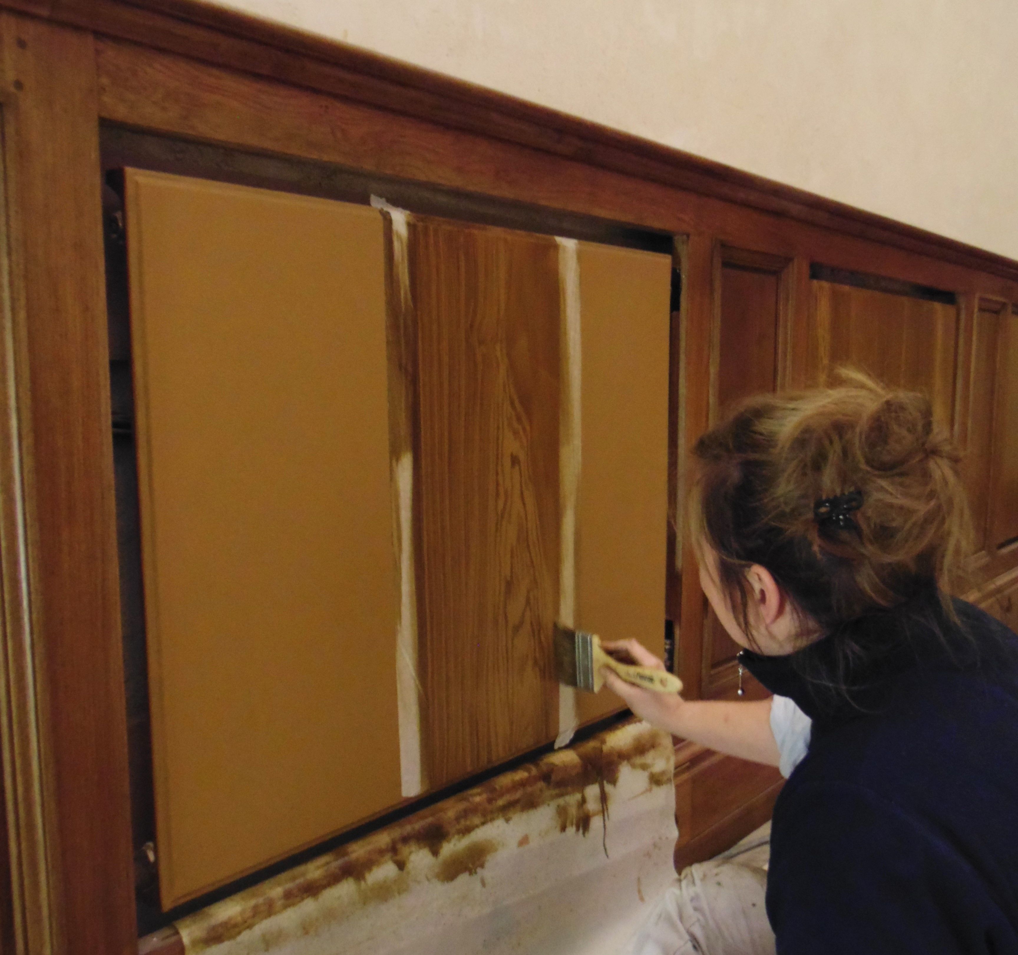 Application d'une patine d'harmonisation aux droits des bois neufs de la salle des apothicaireries.